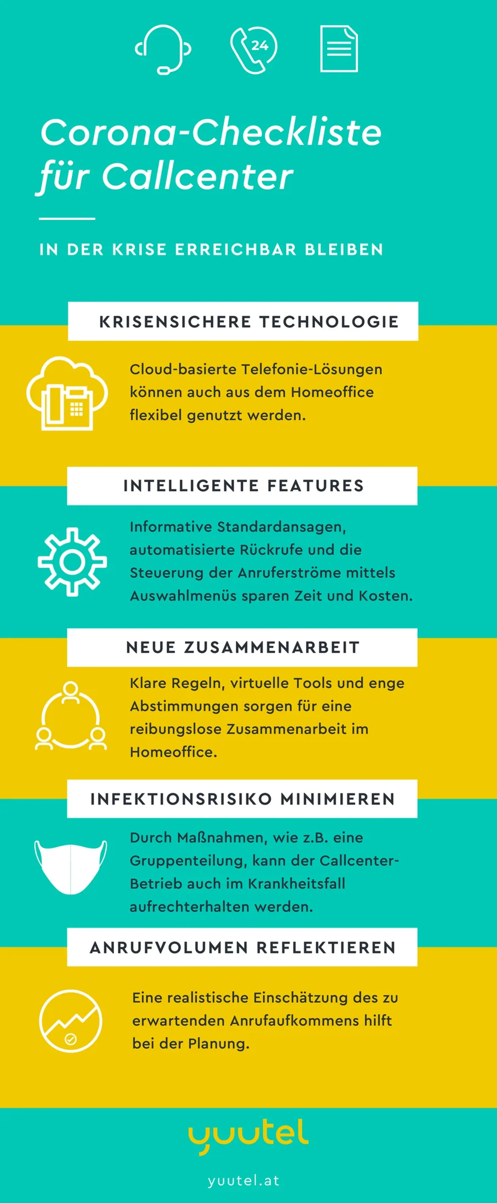 yuutel als Netzbetreiber bietet Ihnen alles, was Sie für ein virtuelles, krisensicheres Callcenter benötigen – ob als alleiniges System oder Backup-Variante zu Ihrer bestehenden Telefonanlage. Einem Kunden haben wir sogar geholfen, ein komplettes Callcenter übers Wochenende in die Cloud zu übersiedeln, um den Anrufsturm durch Corona zu bewältigen!