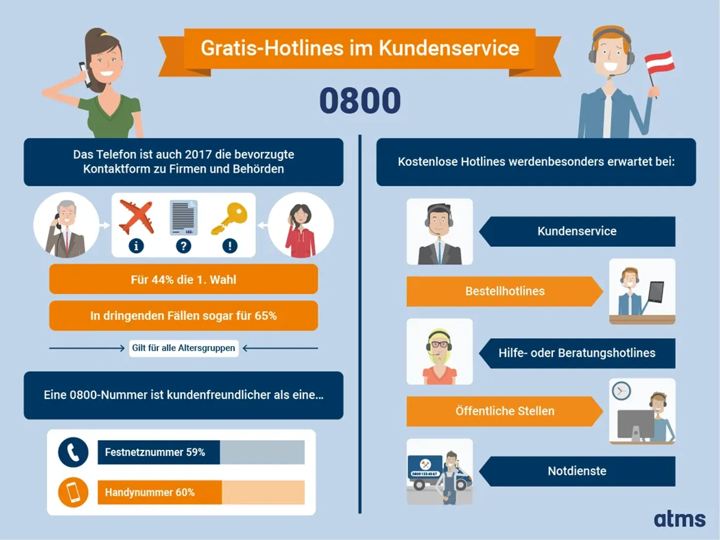 Eine Studie von MindTake Research zeigt außerdem, dass Gratis-Hotlines für die Mehrheit der befragten Österreicher:innen die erste Wahl im Kundenservice sind – 70 % wünschen sich hier explizit eine kostenlose 0800-Hotline. Ihre Kund:innen danken es Ihnen, indem sie öfter zum Hörer greifen und sich für Sie entscheiden!