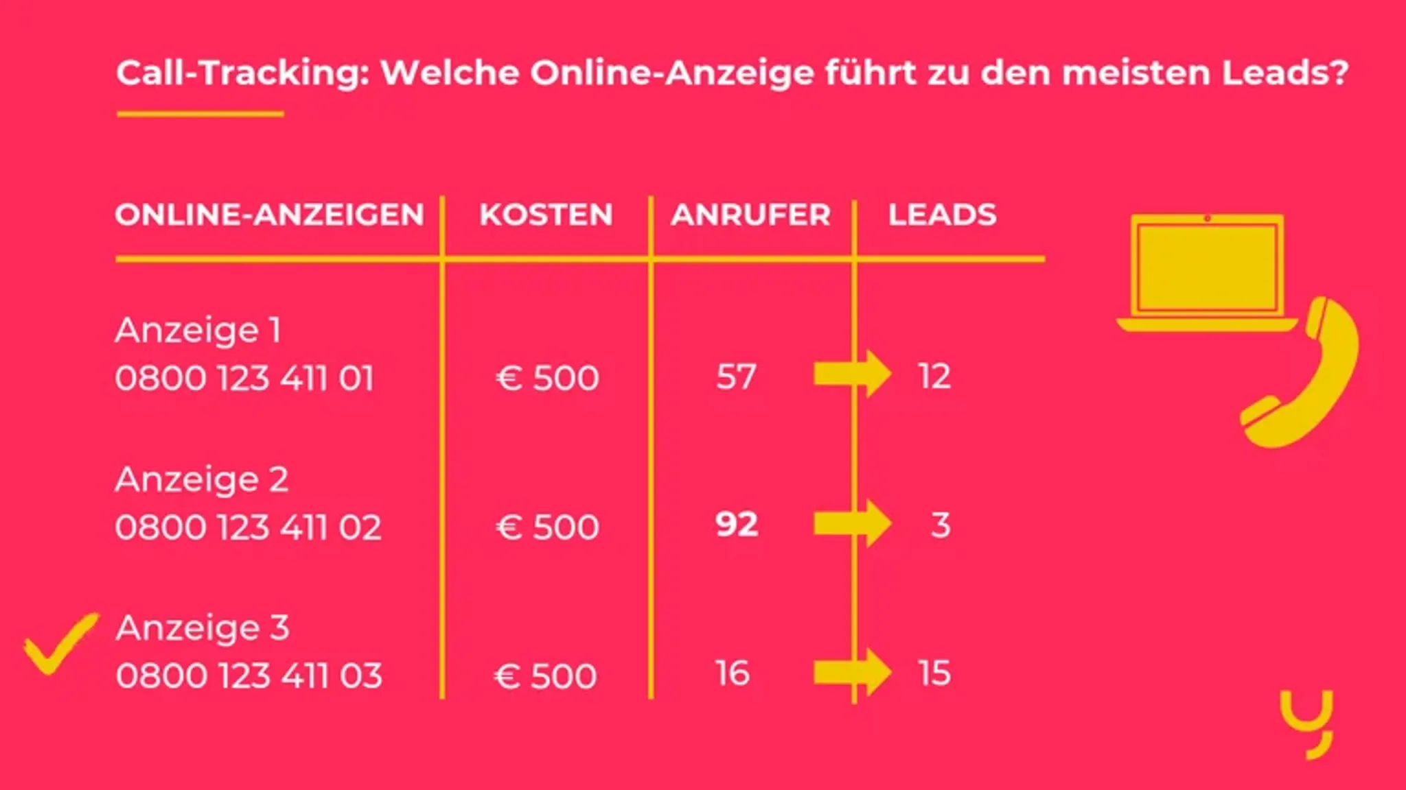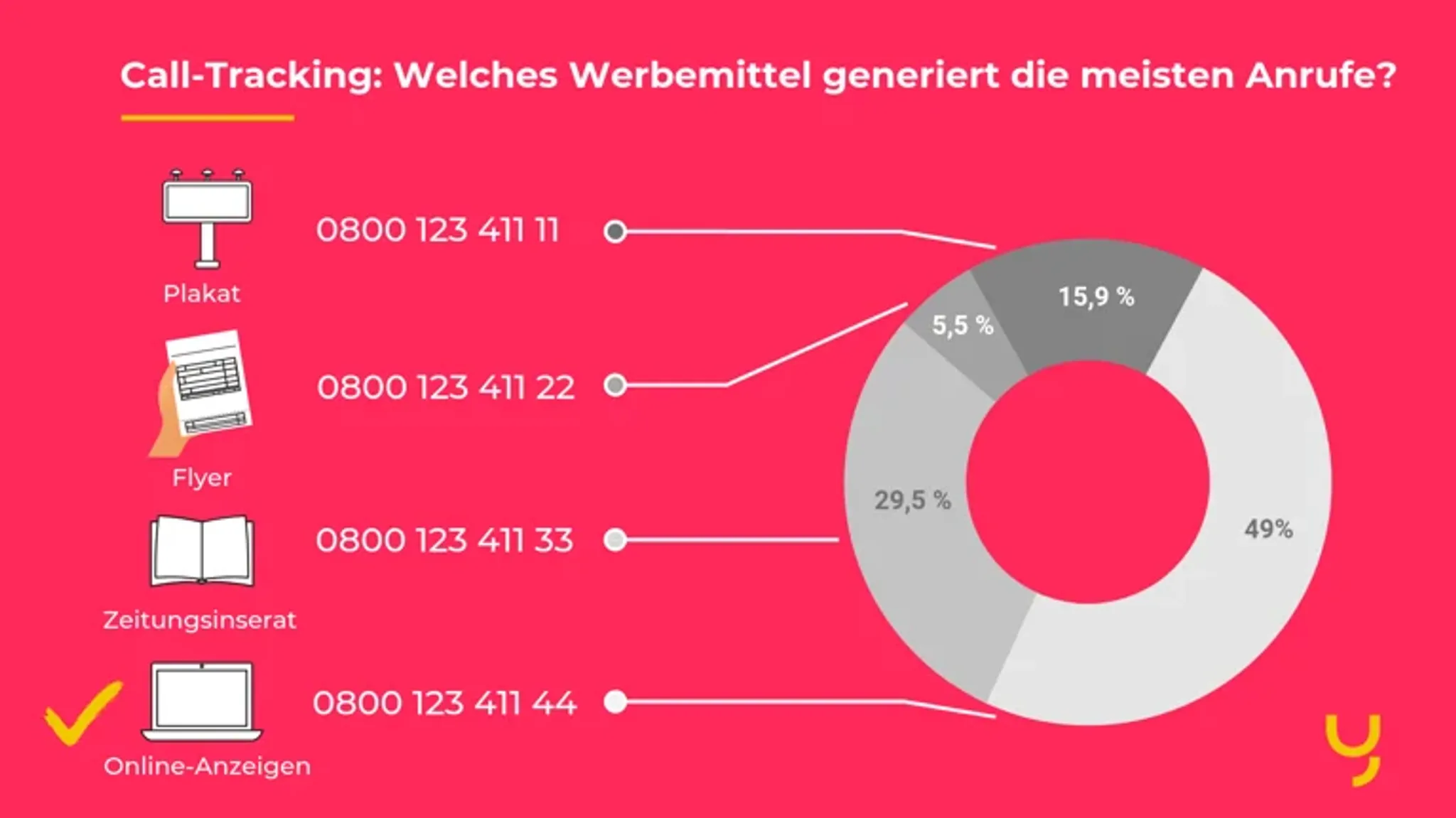Ihr Budget ist begrenzt – das ist aber keine Ausrede für durchschnittliche Ergebnisse! Mit Call-Tracking können Sie herausfinden, welche Werbemittel besonders gut performen, und auf welche Sie besser verzichten sollten.